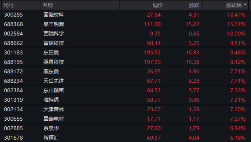 電子板塊也領(lǐng)漲市場。截至午間收盤,國瓷材料、晶豐明源漲幅超過10%,西隴科學(xué)漲停。