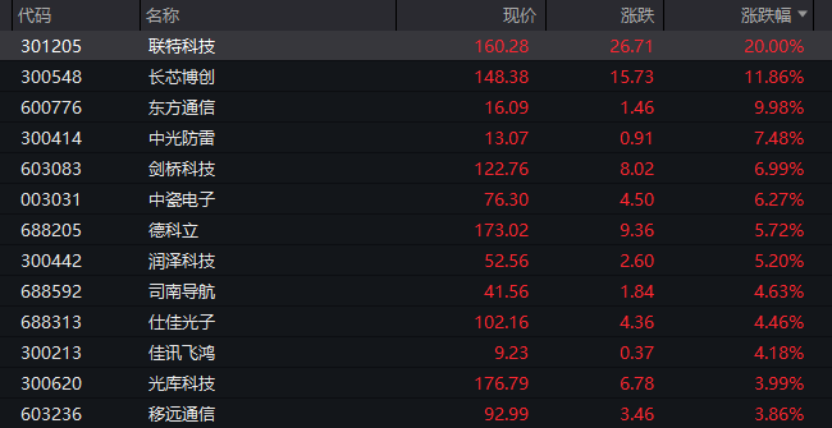 行業(yè)板塊和賽道方面,若按照申萬一級行業(yè)劃分,通信板塊領(lǐng)漲,板塊漲幅超過1%。板塊內(nèi)個股中,截至午間收盤,聯(lián)特科技“20cm”漲停,長芯博創(chuàng)漲幅超過10%,東方通信漲停,另有多股漲幅超過5%。