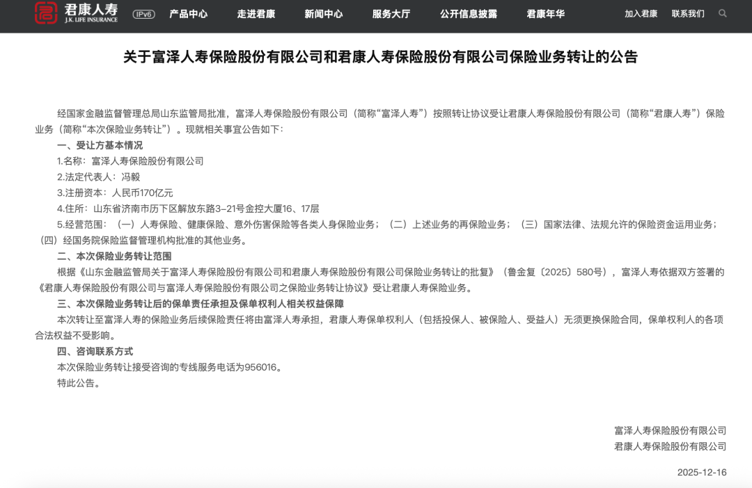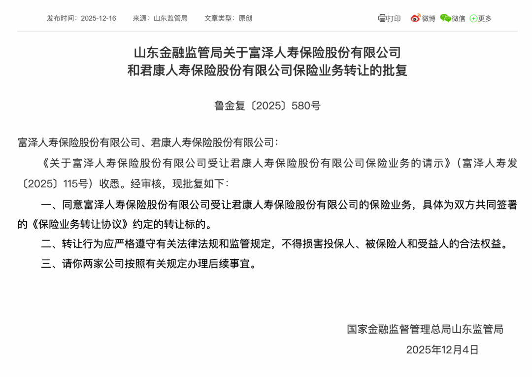 批復(fù)文件還顯示,山東金融監(jiān)管局已于12月4日同意富澤人壽受讓君康人壽保險(xiǎn)業(yè)務(wù)。