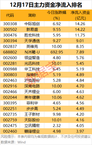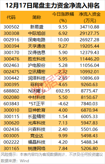 個(gè)股方面,9股尾盤主力資金凈流入超1億元。其中,新易盛、中際旭創(chuàng)、深南電路主力資金凈流入金額均超2億元。